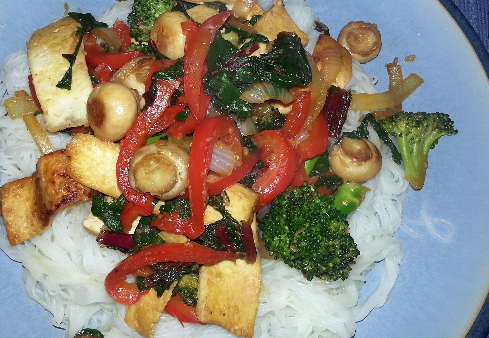 Stir fried broccoli, sweet onions, red peppers, button mushrooms, red Swiss chard, firm tofu, garlic, ginger, and tamari sauce served on rice vermicelli.